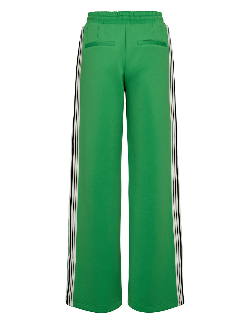 Groene broek met elastiek en een wit koord in de taille, twee steekzakken en rechtvallende broekspijpen met witte, zwarte strepen aan de zijkant.
