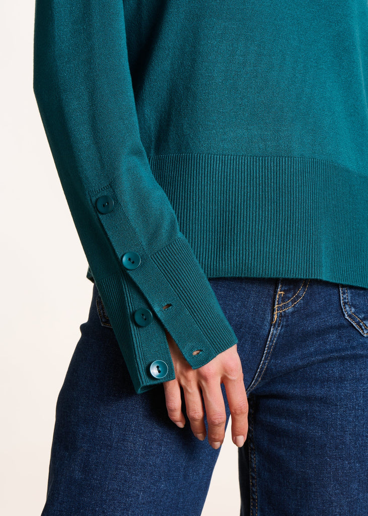 Zachte petrolkleurige trui van viscose, losvallend model, vier knopen links aan de zijkant, ronde hals, brede ribboorden en lange mouwen.