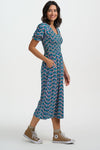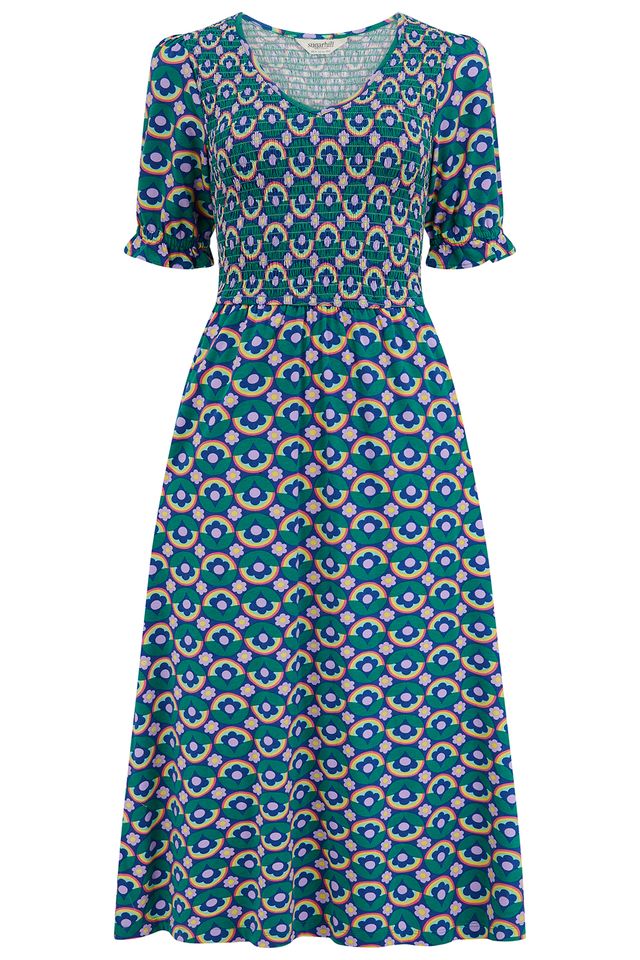 Gebloemde lange jurk van stretchstof, v-hals, roezel onderaan de korte mouwen, smockelastiek aan de bovenkant en twee steekzakken.