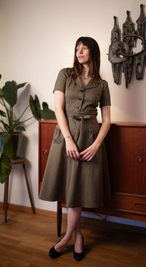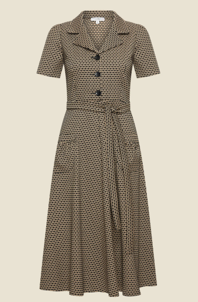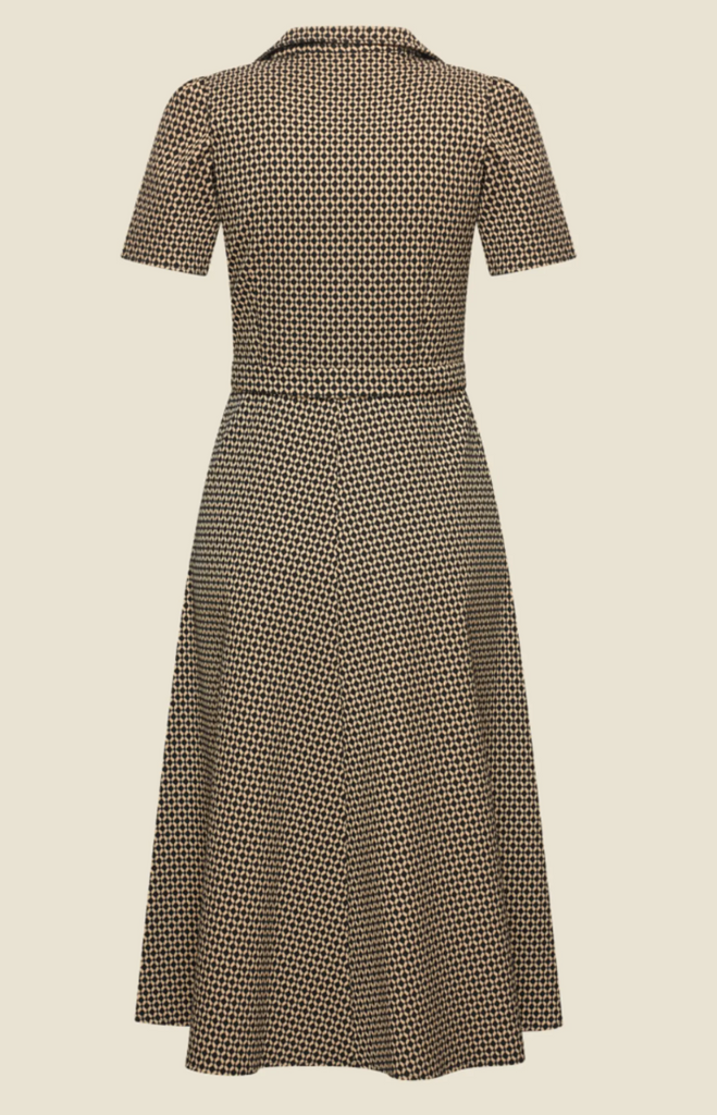 Mid lange jurk met een zwart/bruine print. De reverskraag, knoopsluiting en bijpassende strikceintuur geven de jurk een stijlvolle uitstraling. De revers dress heeft een vrouwelijke, licht getailleerde pasvorm met een a-lijn rok voor een flatterend silhouet.