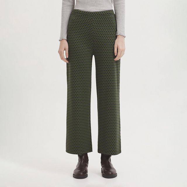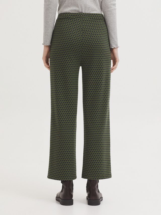 Stretchbroek in een grafische print, elastiek in de tailleband en de rechtvallende broekspijpen vallen tot boven de enkel.