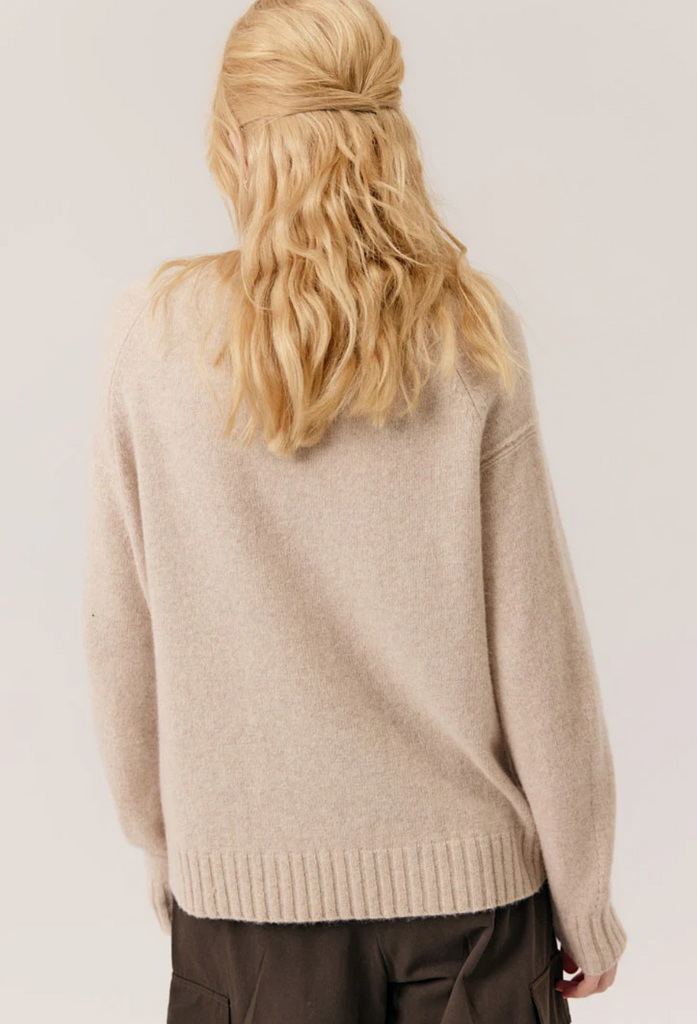 Beige trui met een ronde hals, lange mouwen, recht model, geribbelde boorden en ajour details.