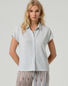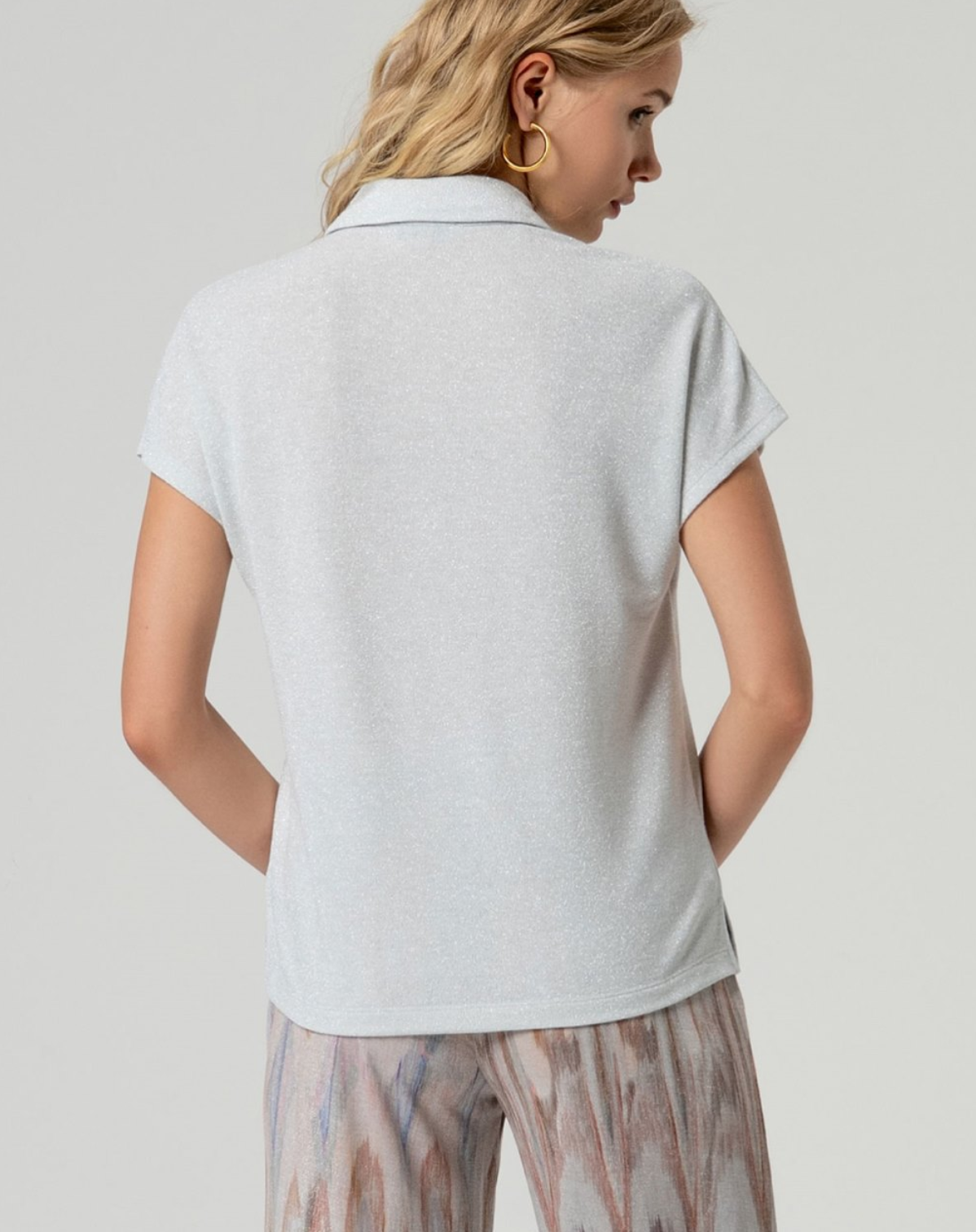 Zilverkleurige bloes met glitter in een losvallend model, knopen, stretchstof en korte mouwen.