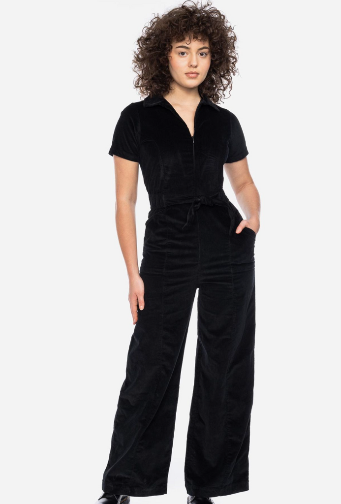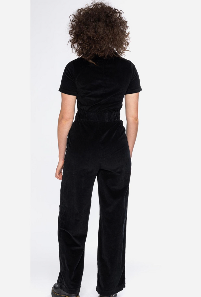 Zwart velvet broekpak met twee zijzakken, een verborgen rits aan de voorkant, een brede elastische tailleband met twee brede strikbanden aan de voorkant, wijde, recht gesneden pijpen, aangehechte kraag en korte mouwen.