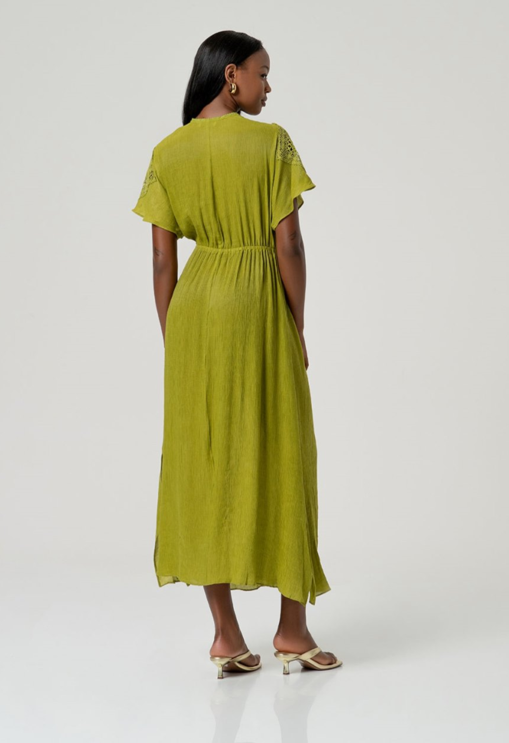 Groene jurk met een overslag v-hals, kant op schouders, elastiek in de taille, licht glanzende stof, geen stretchstof, twee zijsplitten en de lengte is boven de enkel.