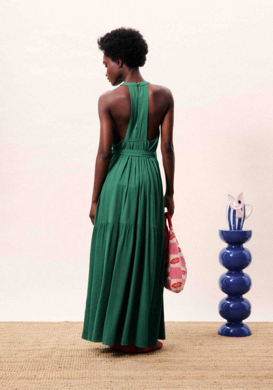 Groene lange jurk, halterhals met striksluiting, afneembare strikceintuur in de taille, wijde zoom met ruches en een open rug met striksluiting.