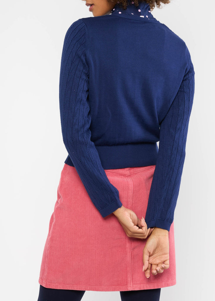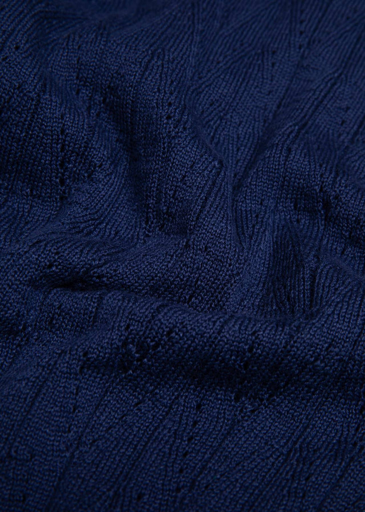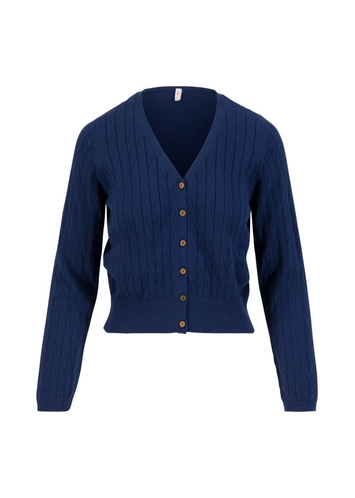Blauw vest met een v-hals, ajour gebreid, knoopsluiting en lange mouwen.