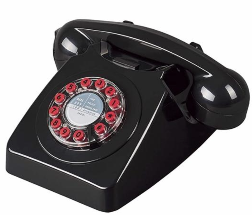 Zwarte 746 retrotelefoon uit de jaren 60 met rode druktoetsen, nummerherhaling, origineel mechanisch belsignaal.