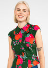 Groene bloes met gekleurde bloemen van biologische katoen en eco-viscose ronde kraag met een roezel, geen stretchstof, aansluitend model en korte mouwen met elastiek in de zoom.