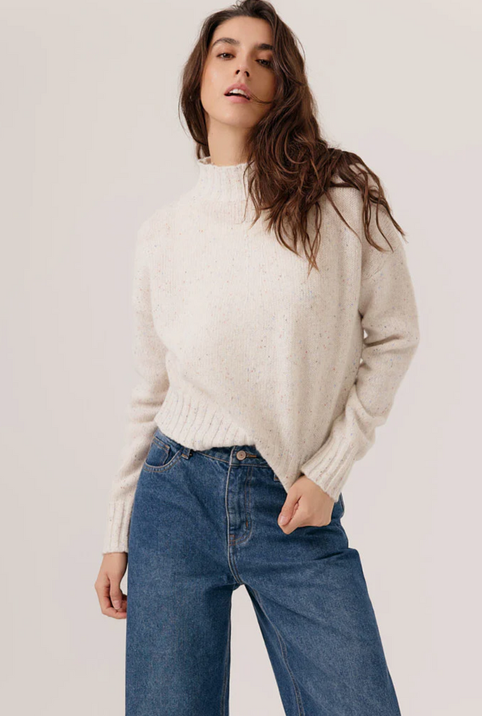 Gemêleerde gebreide trui met een spikkeleffect, opstaande kraag, lange mouwen, geribbelde boorden en een rechte pasvorm.