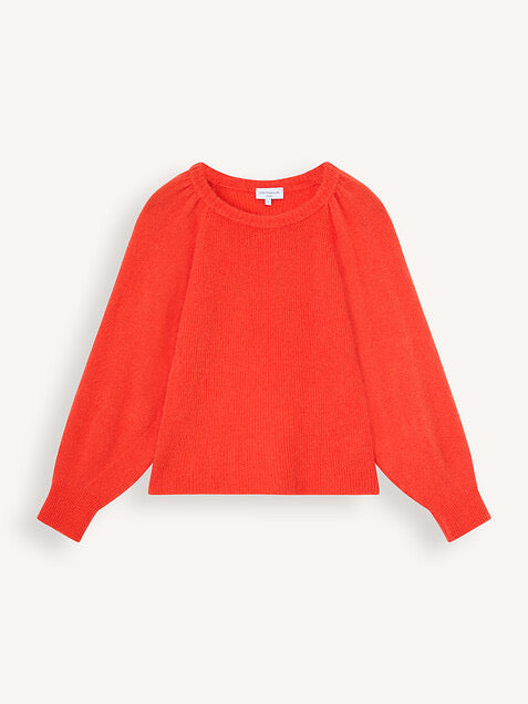 Zachte oranje trui in een losvallend model, plooien op de schouders, ronde hals en lange mouwen. (De trui op de foto is niet de juiste kleur, de trui is roestoranje.)