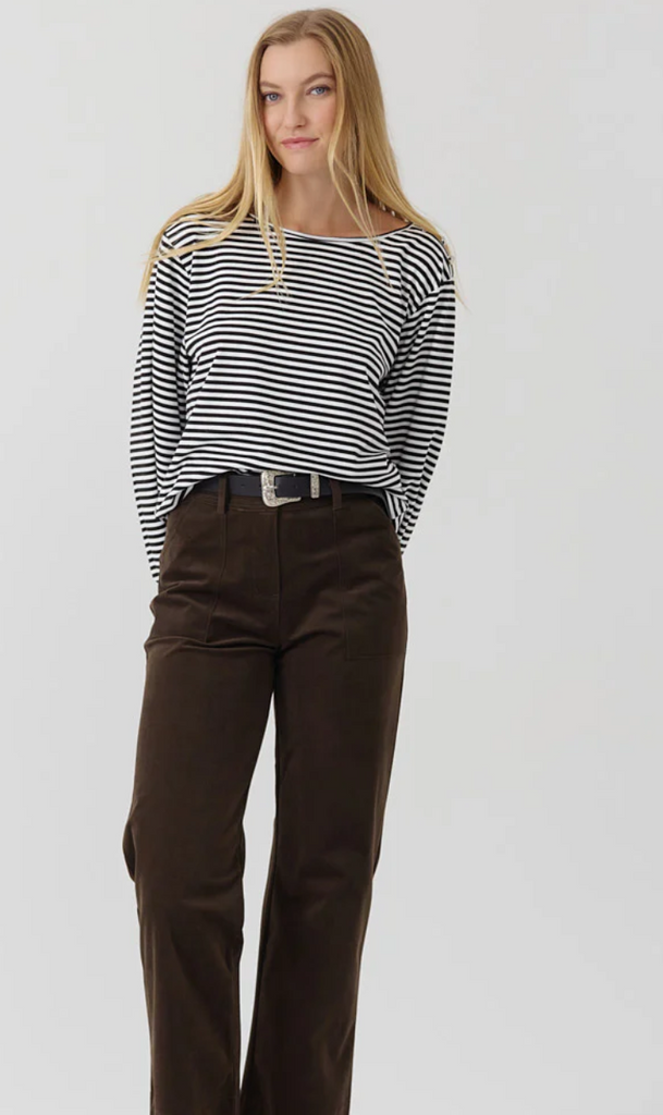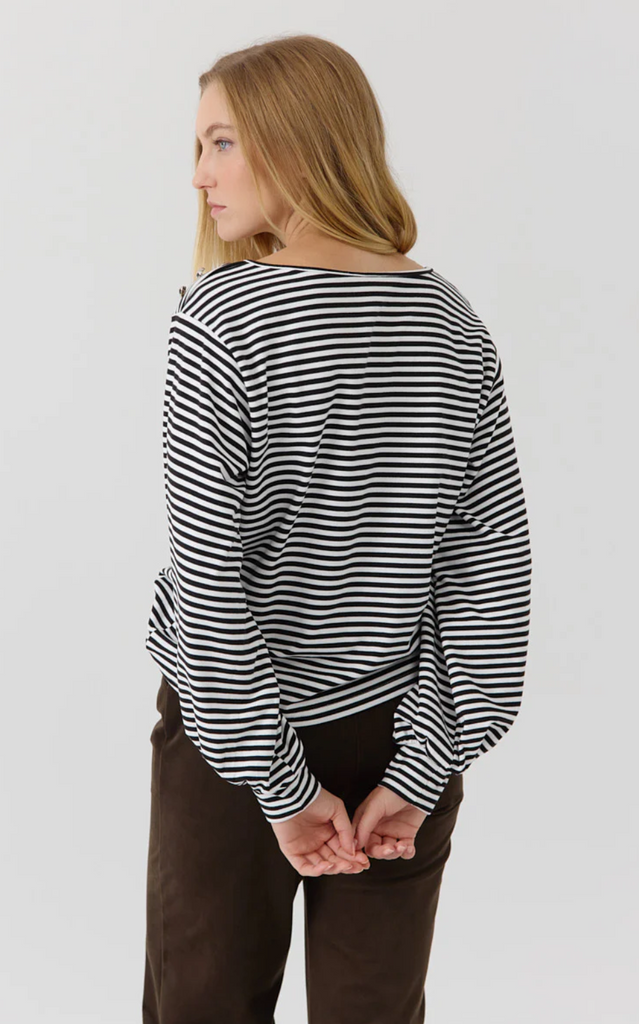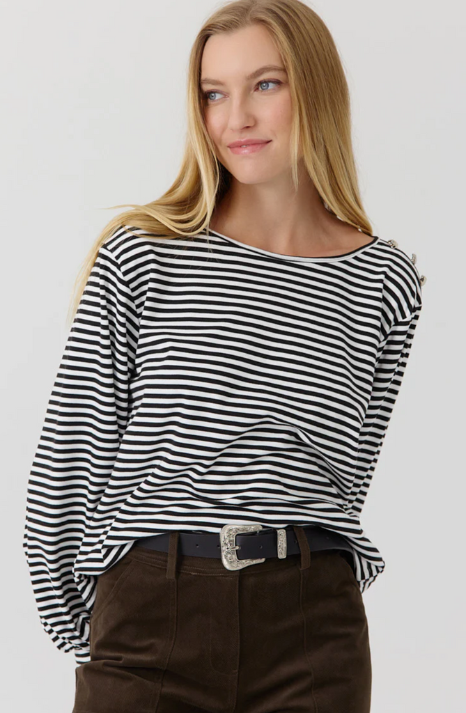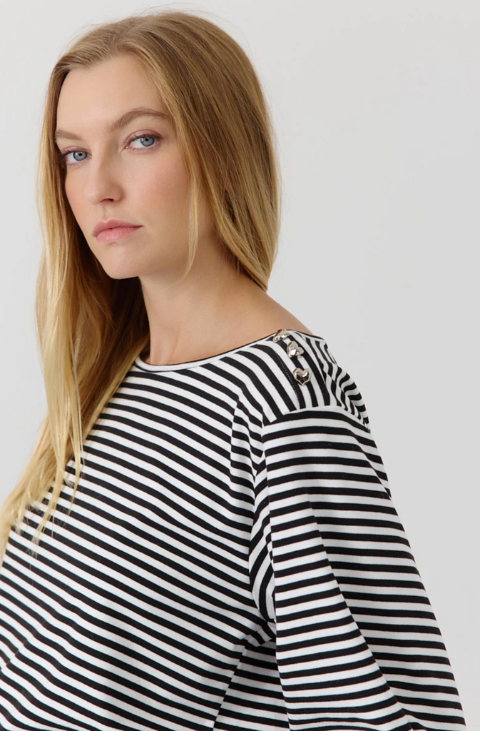 Gestreepte sweater met pofmouwen die bij de manchetten strakker zitten en een gouden knoop detail op de linkerschouder