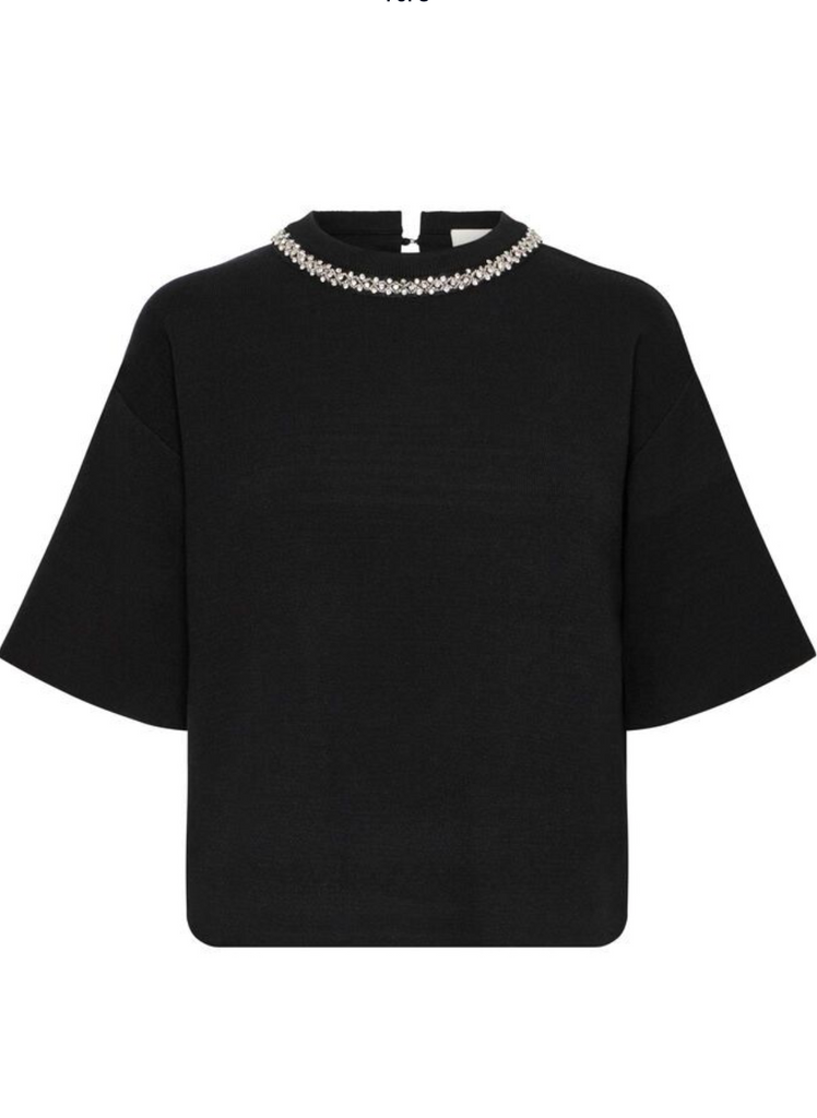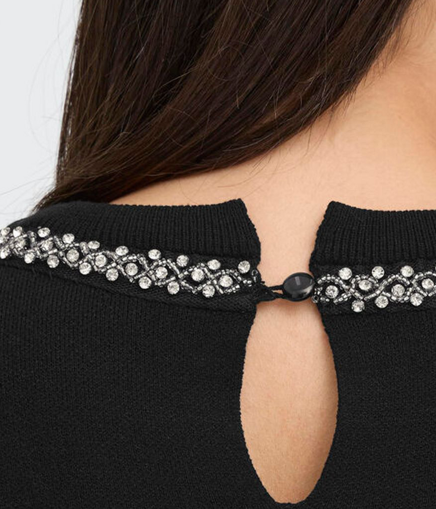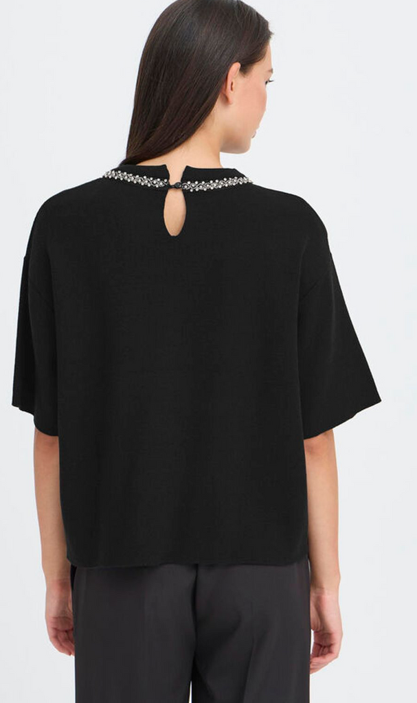 Zwarte trui met kettinghals, half 'open' sluiting en korte mouwen.